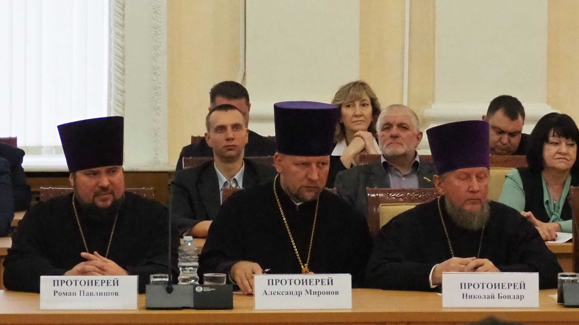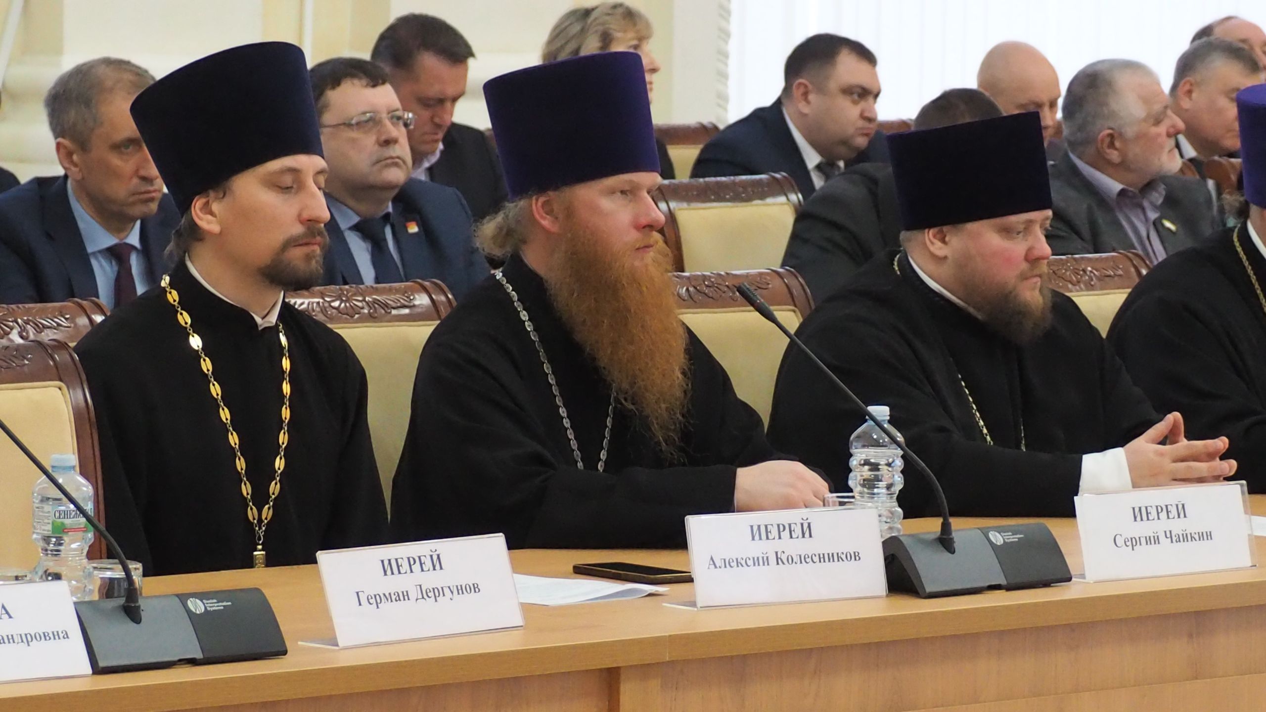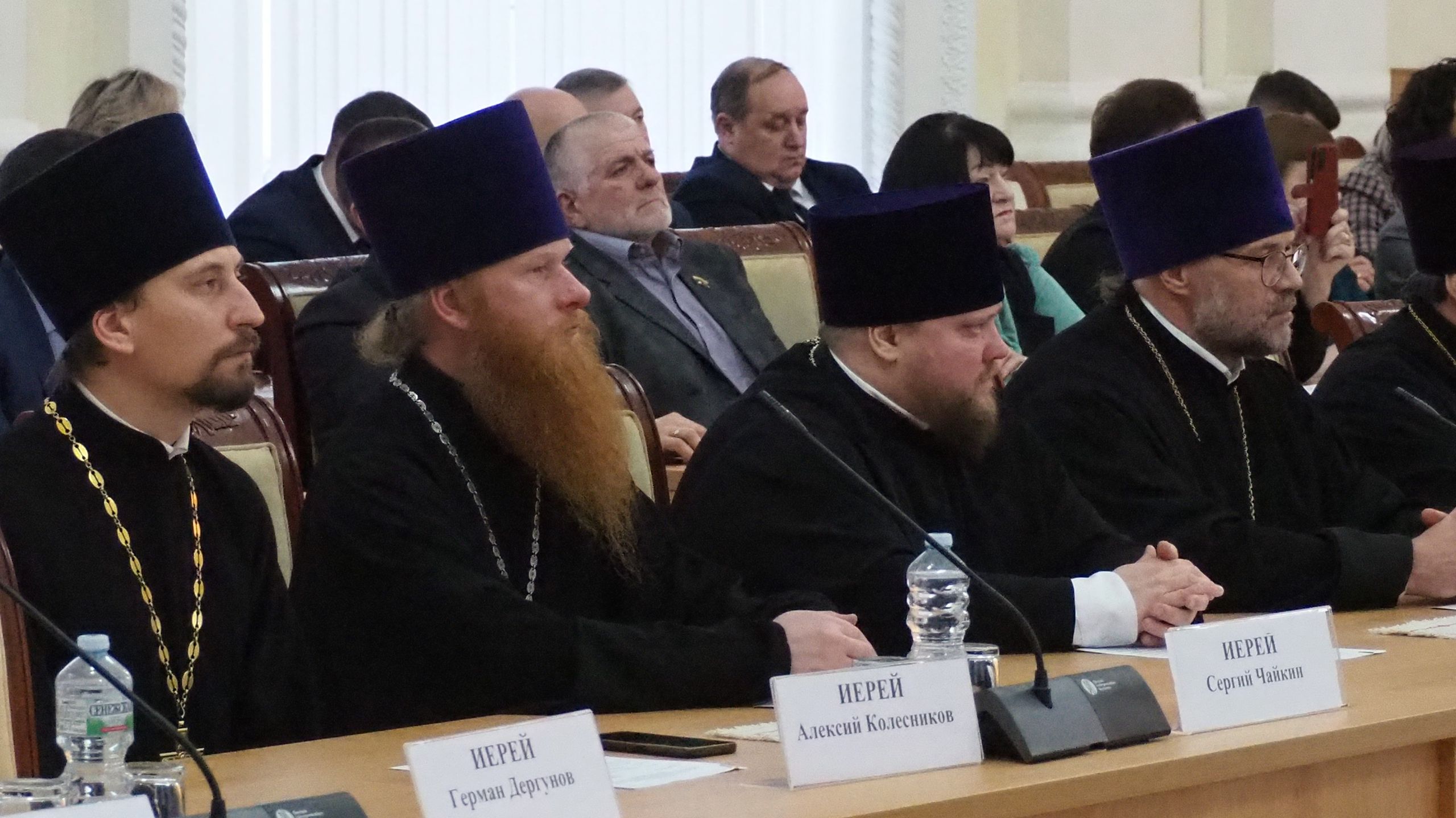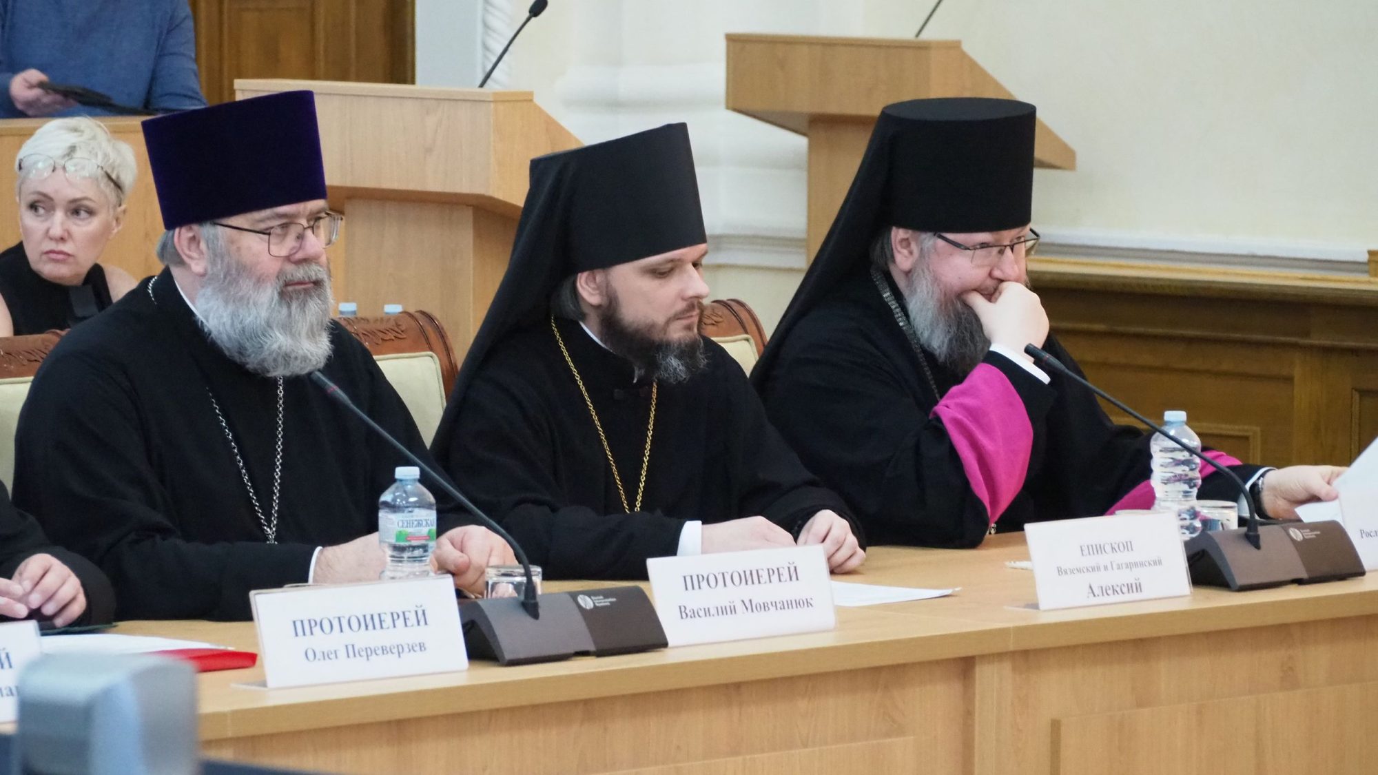 Далее с приветственными словами к участникам обратились епископ Рославльский и Десногорский Мелетий, епископ Вяземский и Гагаринский Алексий.