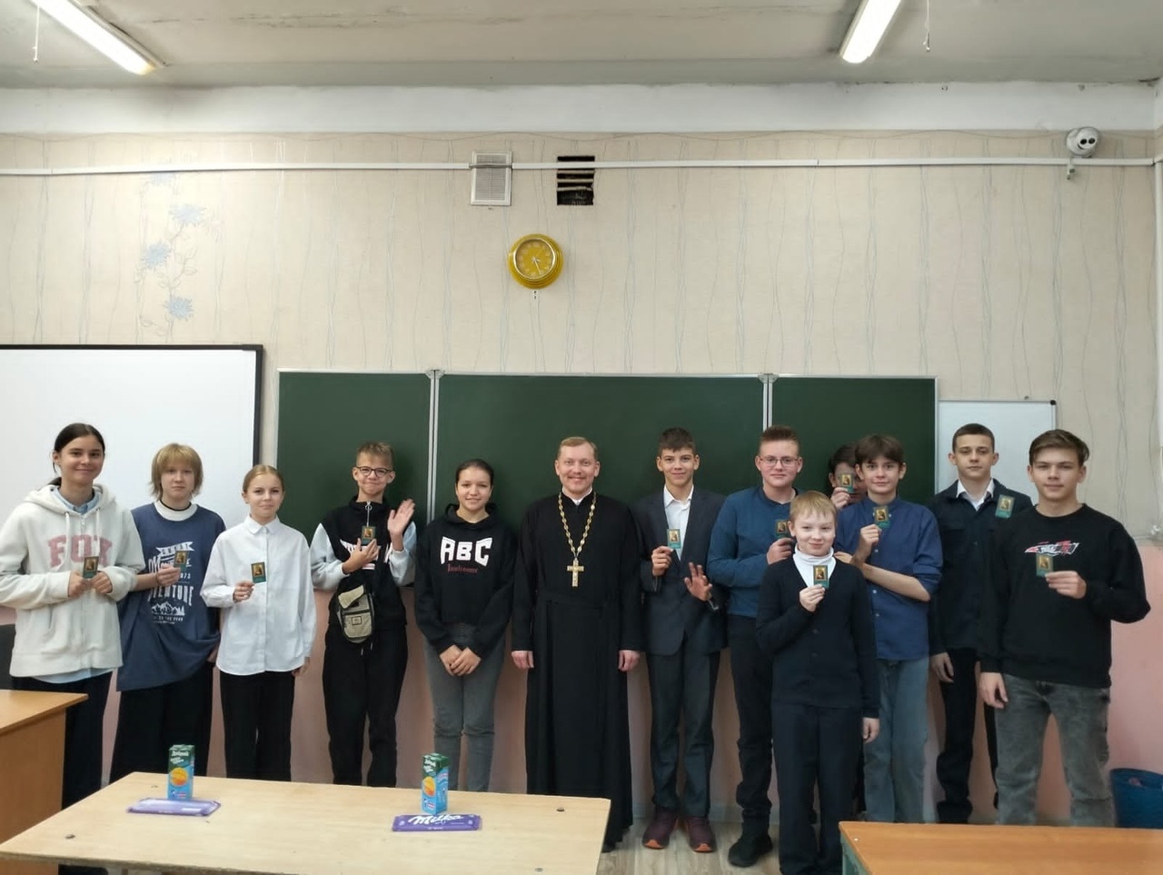 Во время встречи священник рассказывал детям о духовном и нравственном значении подвига народа в Священной войне. По окончании — детям были вручены иконы и подарки.